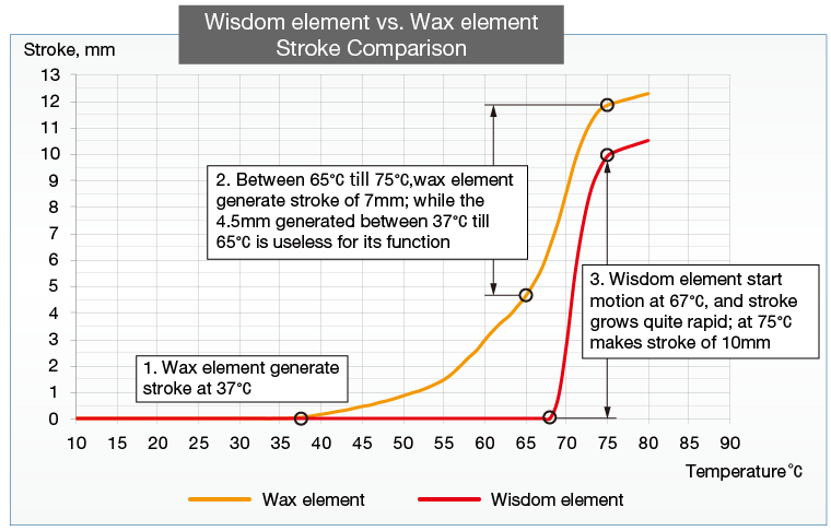 3. Wisdom element with superior tolerance of ±1°C; while wax element is only ±3°C or ±5°C.